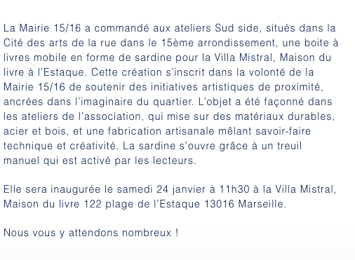 Dans le cadre de la consultation commerciale organisée par la Mairie des 15ème et 16ème arrondissements de Marseille et portant sur la réalisation d’une sculpture fonctionnelle en forme de sardine servant de bibliothèque / distributeur de livres en extérieur pour la Villa Mistral – Maison du Livre,